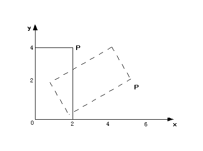 図2.4にオリジナルの長方形およびその回転後の図形(図中の点線)を示す。例えば、点P[2 4]は、式(2.8)から変換後は 2次元アフィン変換の一般型は次式で表せます。