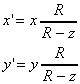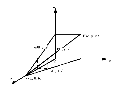 簡単のため、投影面がx-y平面で、投影中心(視点に相当)がz軸上(原点から距離R)にある場合の、点P(x, y, z)の透視投影について説明する。図2.6のように、点Pが投影面に投影されたときの点をP'(x', y', z')とすると、三角形の相似から、次式が得られる。