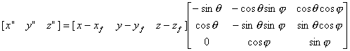 図2.7:透視変換 この変換は、まず (a) 注視点を原点とするように平行移動し、 (b) 視線(注視点と視点を結ぶ直線)が、投影面に垂直になるように回転する。 (c) 最後に投影面への透視投影をする。 前述の4×4の変換行列で表現するのが理想であるが、その場合演算数が多くなるので、ここでは、通常のマトリクスで表現する、移動と回転を組み合わせた式は、
