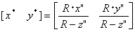 (2.17)となる。ここで分母の(R-z'')は視点からの奥行きに相当する。 図2.8: 透視図形 | |