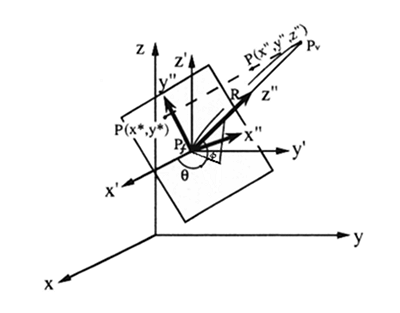 となる。投影面での座標系での投影された点Pを(