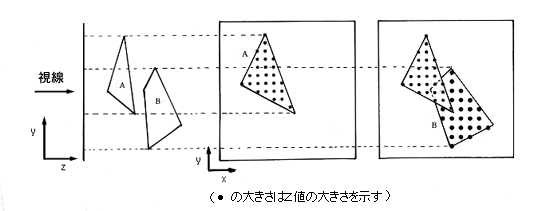 Z-バッファ法(デプスバッファ法)は、表示しようとする面のZ値(視点からの奥行き)を各画素ごとに蓄える方法である。各々の面を透視投影面に投影し、その面が占める画素の位置に、その面のZ値を格納する。この際、すでに格納されている面があれば、そのZ値(計算式は付録参照)と比較し、小さい方の面の情報を記憶する。