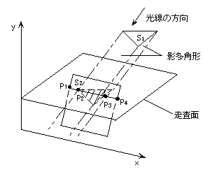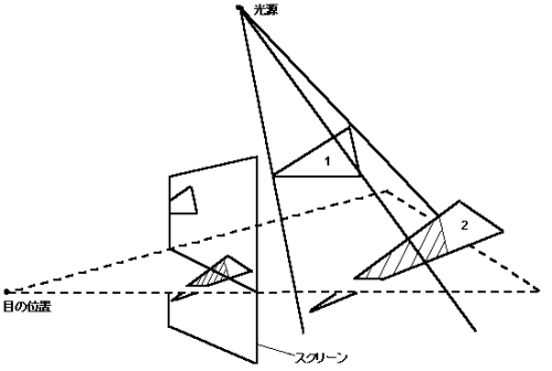 光源からみたときの表の面の各辺を、処理しようとする面へ走査線ごとに投影する方法(図5.14参照、面2による面1上の影の計算)で、影の表示法としては初めて開発されました。