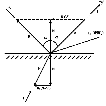 ここで、第1項から、環境光、拡散反射光、鏡面反射光、屈折光(透過)の成分です。Nは面の単位法線ベクトル、Lは光の入射方向ベクトル、mは光源数、Sは鏡面反射光、Tは屈折方向からの光、