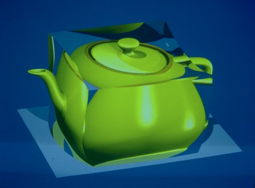 左図は屈折を考慮したもので、透明物質中にティーポットが埋め込まれた例です(レイトレーシング法で表示)。