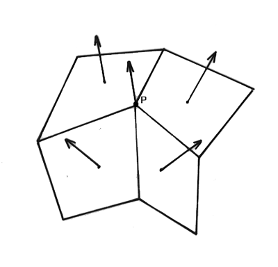 なお、多角形の頂点における法線ベクトルは、その頂点(図5.21の点P)を含む多角形の法線ベクトルの平均値を用います。この方法では、輝度のみ補間することから、ハイライトの計算が正しくできない欠点があります。