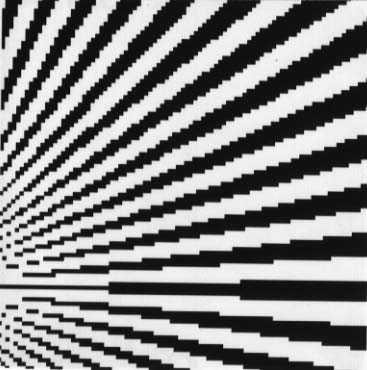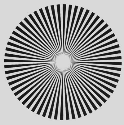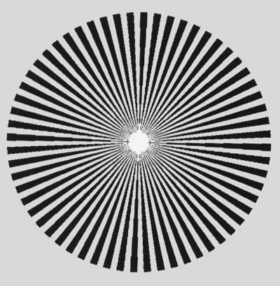 (a) (b) 図6.2:エリアシングの例(中心部にモアレが見える) (3) 小さい物体あるいは細長い物体が表示されないことがある。 (4) ハイライト(物体で上で反射光のとくに強い箇所)やテクスチャーが部分的に欠如する。 (5) 動画の場合、面の境界が波打ち現象を示す。また、小さい物体が見え隠れする。 こうした現象を総称してエリアシング(aliasing)という。また、このエリアシングを取り除くことをアンチ・エリアシング(anti-aliasing)という。図6.1および6.2(b)にアンチエリアシング処理を施した例を示めす。