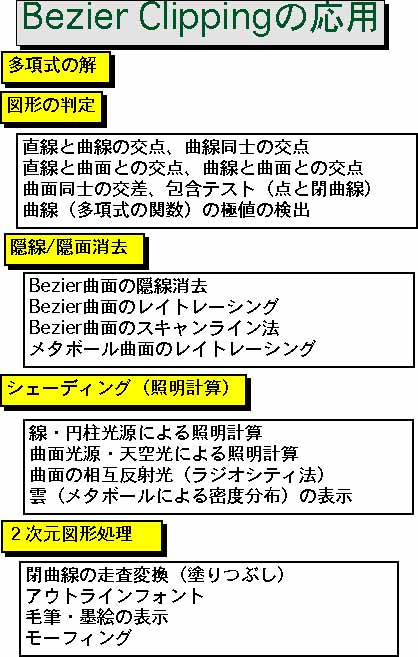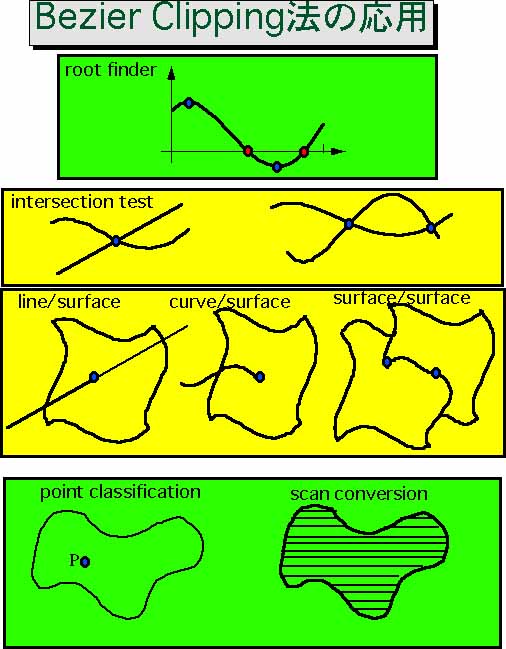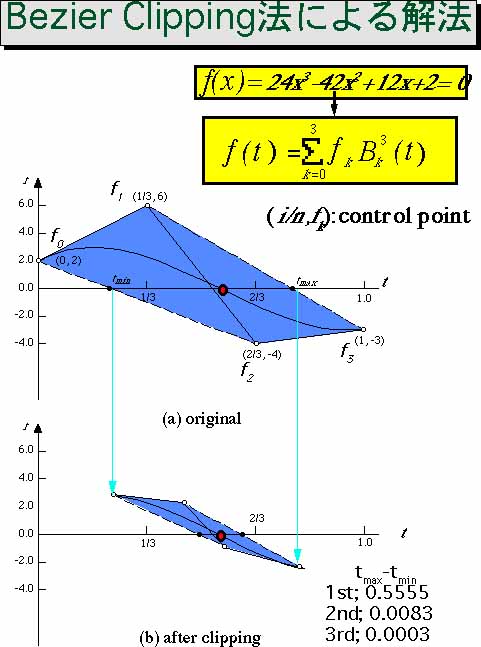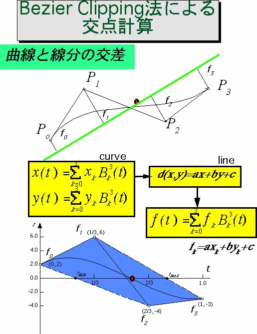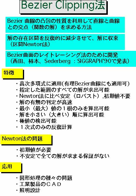 Bezier Clipping はBezier曲線の性質を利用することで、交点計算を安定して求める方法で、1990年に西田、Sederbergらにより開発された方法である。Bezier曲線を分割する処理を再帰的に行うことからBezier Clipping 法と名ずけられた。当初は曲面のレイトレーシング法が目的でしたが、多項式の解法から3D物体のレンダリング(表示)まで種々の図形処理への応用が可能となった。