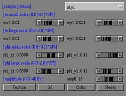 [sample pattern]のチョイスボタン で、空の雲(sky:type1,type2)と、炎(fire)、 木材の木目(wood)、その他のサンプル(sample)を選択できる。