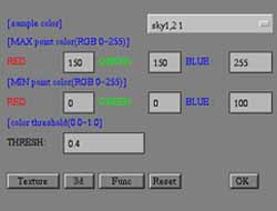 [sample color]のチョイスボタン で、色の初期値を空の雲(sky:type1,type2)と、炎(fire) 木材の木目(wood)、その他のサンプル(sample)を選択できる。