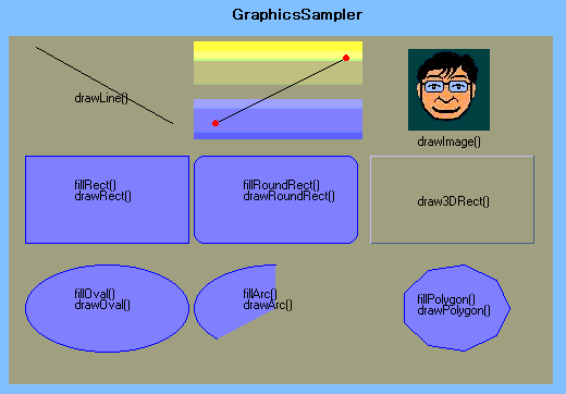 public class Graphics extends Applet { public void init( ) { // 初期化プログラムの挿入} public void paint(Graphics g) { // 表示プログラムの挿入} } |